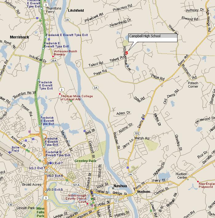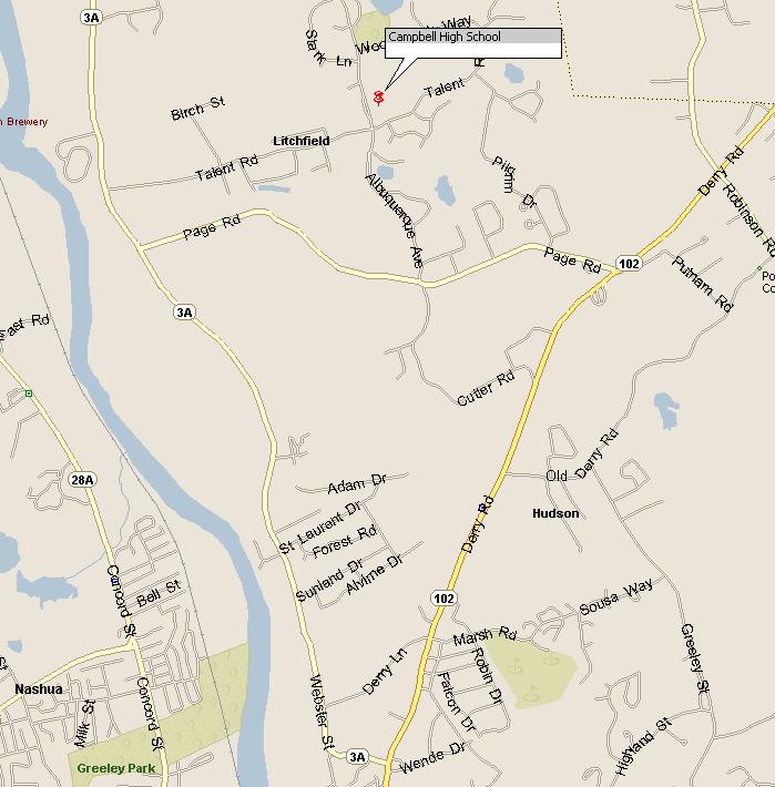Take Route 111 to Hudson and turn left on to Route 102. At about the third set of lights (just after the shopping center on the right), turn left onto Route 3A. Follow 3A for a few miles and turn right on to Talent Road. Follow Talent road for just over a mile and turn left onto Albuquerque Road. Campbell High is on the right just after you turn onto Albuquerque Road. The soccer field is behind the school.